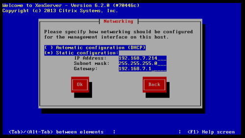 在如圖13所示的[Networking]頁面中,必須決定此XenServer的TCP/IP位址設定。一般來說都是自行手動輸入一組可用的靜態IP位址配置(Static),包括了子網路遮罩與閘道位址。不過如果後續連線XenServer的管理方式,將全面採用完整網域名稱的連線方式,則採用預設的動態位址配置方式(DHCP),其實也是無妨的。無論如何相關網路位址的配置,後續在完成安裝之後,仍是可以進行修改的。點選[OK]繼續。