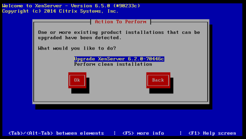 無論如何在我們動手升級現行的XenServer 6.2系統之前,最還是能夠先對於整個系統進行一次完整性的備份,並且將所有運行中的虛擬機器正常關機。接著便可以放入XenServer 6.5的安裝光碟來進行開機,完成啟動之後系統將會出現如圖24所示的提示訊息,這表示系統已經偵測到舊版的XenServer版本。您可以決定立即進行就地升級,或是完成一次全新的安裝。在此我們選擇前者。