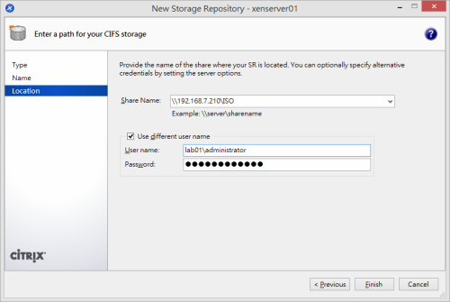 請注意!如果不想在CIFS儲存的連線設定中,再一次輸入網域使用者的帳戶密碼,只要未來配置好XenServer與Active Directory的驗證機制即可解決。
