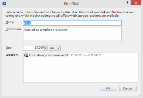 在如圖47所示的[Edit Disk]頁面中,便是新增虛擬硬碟的設定介面,在此可以自訂名稱、描述、容量大小以及所在儲存區,這個存儲區可以是XenServer本機儲存區或是其他網路共用的儲存區(例如:iSCSI、NFS)。點選[OK]繼續。