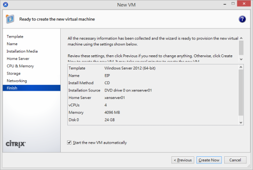 最後在如圖50所示的[Finish]頁面中,請確認前面所有針對此新虛擬機器的設定值。確認無誤之後便可以點選[Create Now]。如果您希望在完成新虛擬機器的建立後,立即啟動Guest OS的安裝作業,則可以將其中的[Start the new VM automatically]設定勾選。