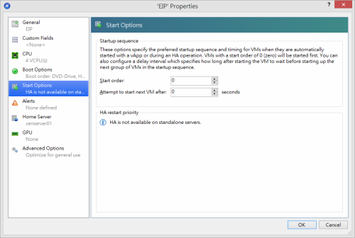 在如圖61所示的[Start Options]頁面中,主要是用以設定當虛擬機器是架構在XenServer的高可用性(HA)架構下,一旦發生了容錯移轉的作業時,此虛擬機器啟動的優先順序,當數字被設定越小時則越優先執行。另外還可以指定在此虛擬機器執行後多少秒數以後,才繼續啟動下一個順位的虛擬機器,此設定對於許多前後端分開的應用系統來說,是一項相當棒的設計,因為擔任後端的資料庫系統服務肯定是需要優先被啟動的,而且在作業系統剛啟動完成之初,通常資料庫的服務還必須等待數十秒之後才能夠完全啟動完畢,最後才是繼續啟動接下來的前端應用系統程式或網站服務。如今這一些原是人工的操作流程,目前都可以在XenServer的虛擬化平台運作下全部自動化。