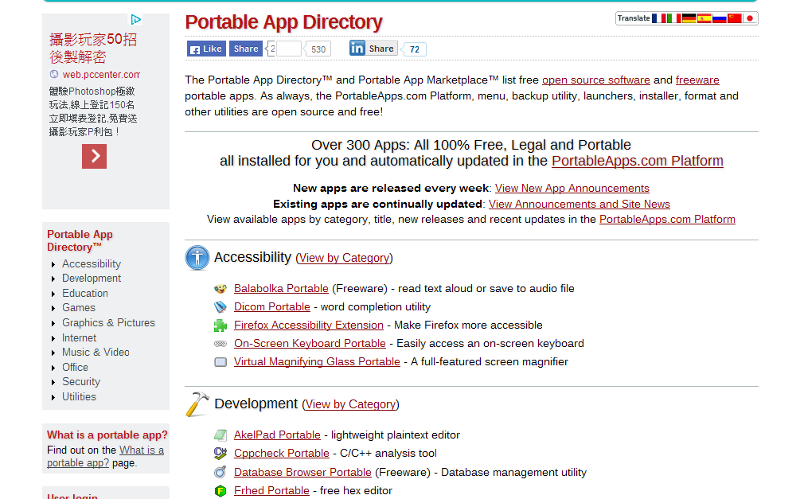 我個人過去幾年,還常使用WINDOWS平台時,常會上右列這個名為「綠色工廠」的網站:https://portable.easylife.tw/,來下載這些不需要安裝,而可以直接使用的應用程式;另外一個個人常使用的綠色軟體相關網站,則是右列這個「PortableApps.com」:https://portableapps.com/,其上提供下載軟體的操作介面雖然大部份都沒有中文化,但數量上與分類上比起「綠色工廠」更豐富。