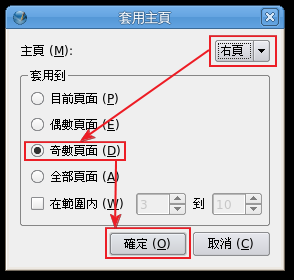 然後請在右上方選擇左、右頁,接著選擇你要套用的頁面,由於在這個版面中,右頁都是奇數頁,所以在這裡我選擇了「奇數頁面」。選擇好用請按一下〔確定〕按鈕。