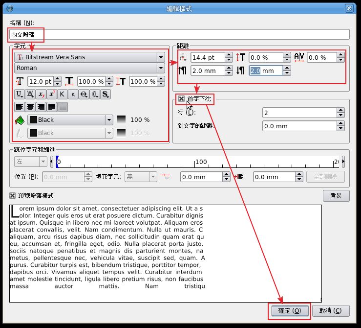 接著會出現另一個「編輯樣式」視窗,請先幫你的樣式取個相應的名稱,這樣之後就可以立刻判斷樣式該使用在什麼地方。然後依照自己想要的樣式調整「字元」和「距離」區域的設定,如果你想使用「首字下沉」(首字母變大)的話,也可以選擇後設定。將要使用在內文的樣式都設定好後,請按一下〔確定〕按鈕。
