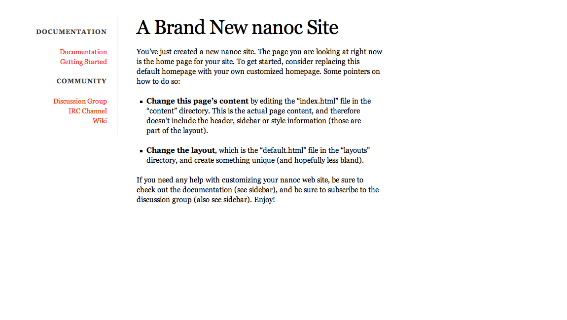 上述步驟成功讓 nanoc 編譯 markdown 成 html 檔案,但是旁邊的 side bar 還是舊有的預設條目。這可以透過修改 layouts/default.html 來改變。(注意,我們在 Rules 中指定要用 default 做 layout,所以我們現在修改這個檔案。如果讀者想要嘗試也可以自訂 layout)