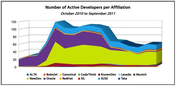▲ 圖2:LibreOffice 的活躍開發者,依照開發者所屬的組織區分
