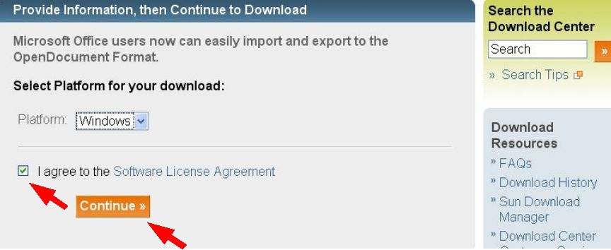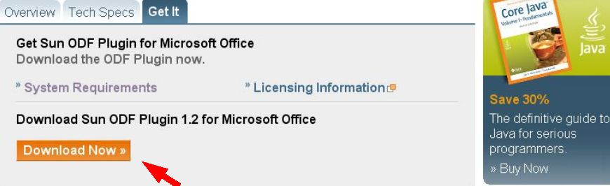 下載 Sun 的 ODF plugin 程式的方式是到 「Sun ODF Plugin for Microsoft Office」這個網頁,點選網頁中上方的「Get It Now. Free」那個超連結,連到下個網頁,之後點選網頁中的「Download Now」超連結,
