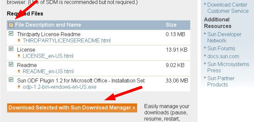 然後進到下載的網頁,要選擇下載的項目,有兩個版權宣言檔案、一個說明檔與一個程式檔,我是全部都選擇、然後點選「Download Selected with Sun Download Manager」,