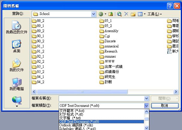 安裝完之後,打開 word 時,就可以開啟 odt 檔。可以在「開啟舊檔」裡面找到「ODF Text Document(*.odt)」的選項,如此就可以開啟 odt 檔了。