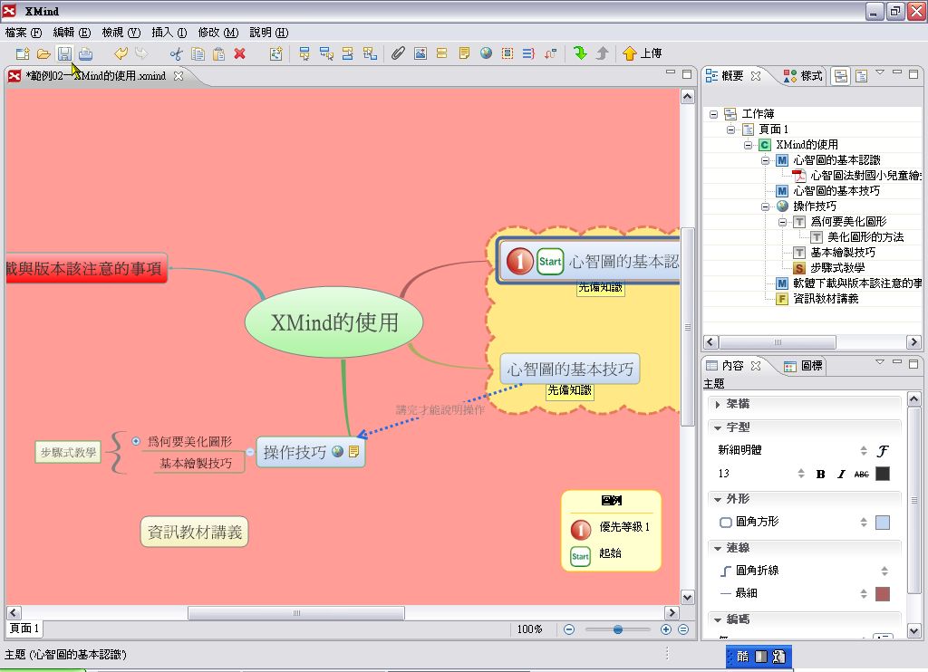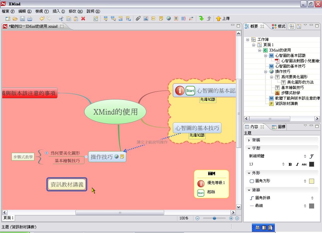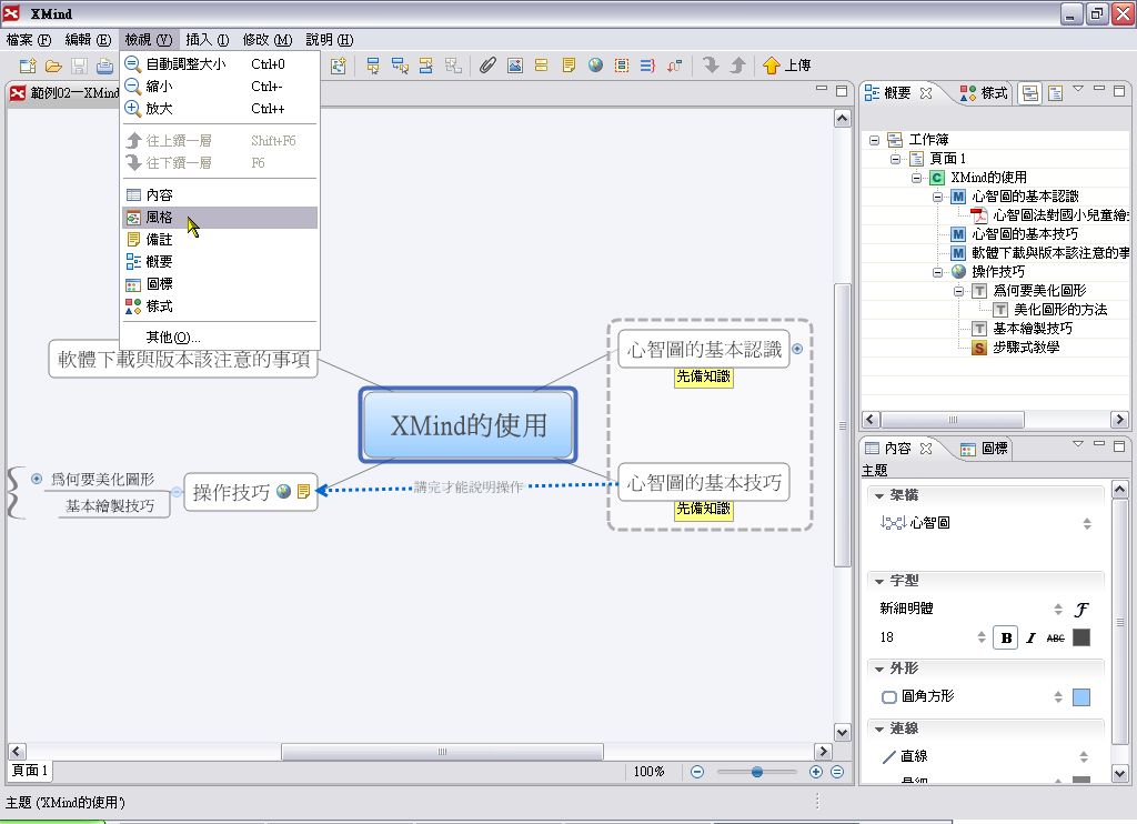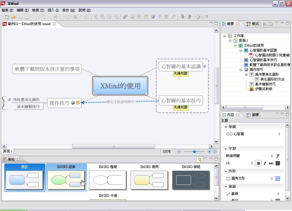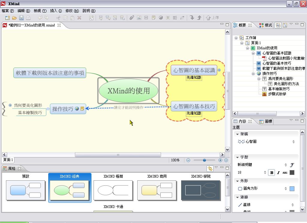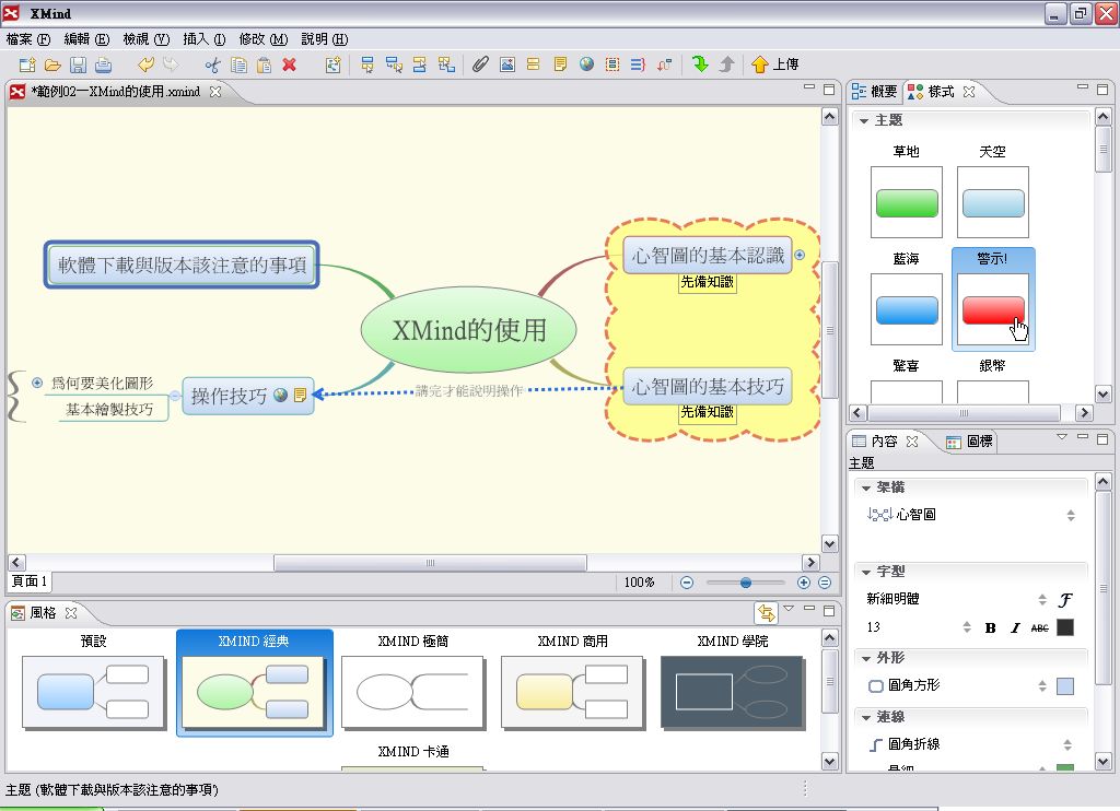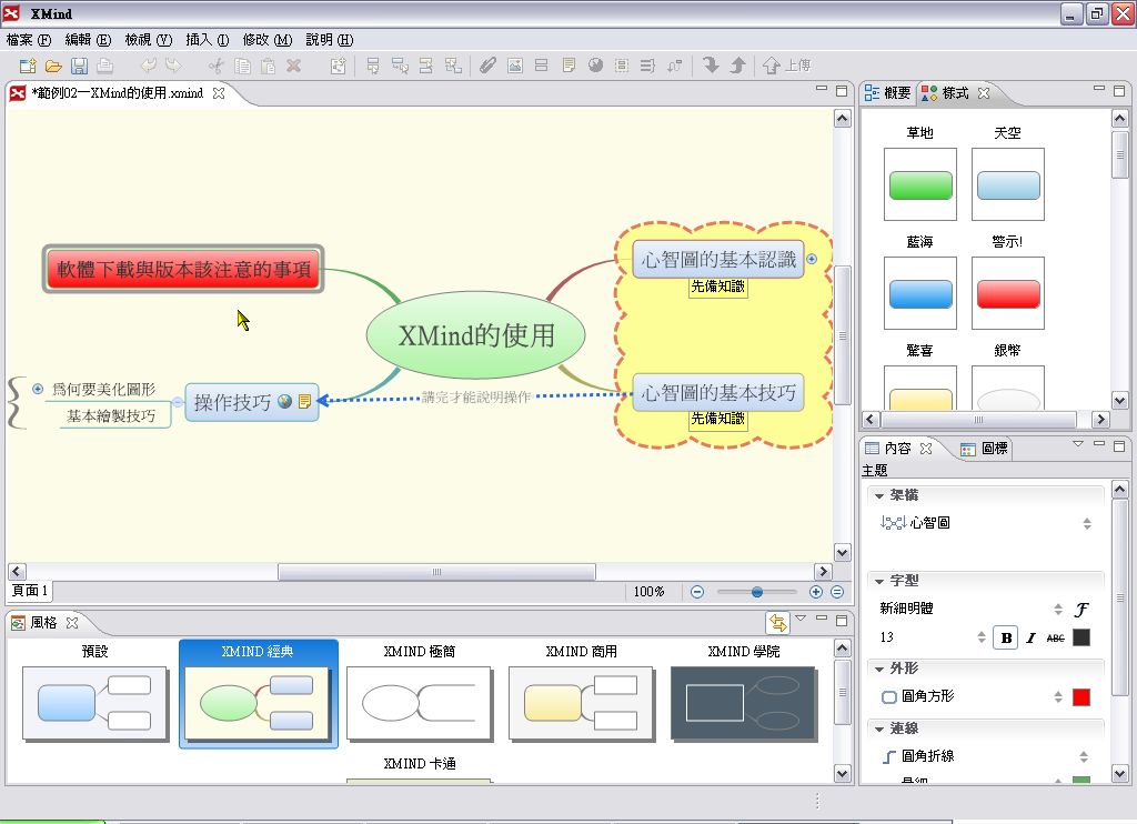 風格與樣式,主要是用來美化整體圖形或強調特定重點之用。這些都是 XMind 事先設計好的,簡單的幾個步驟,很快就能製作出活潑好看的心智圖!