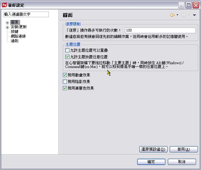 按功能表的「編輯」\「喜好設定」,開啟喜好設定視窗後,在左邊的欄位內點選「圖面」,在右邊的「主題位置」下,確定已經勾選「允許主題放置任意位置」,如此按住 Alt 鍵拖曳主題時才會有效果。