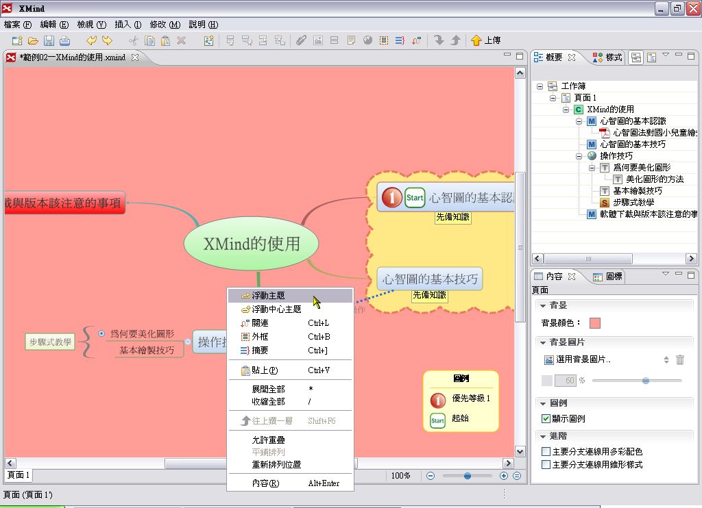 如果要加入額外相關的主題,或者是對整個心智圖下一個標題或定義,可以加入浮動主題。這裡我們想要對於「操作技巧」多作一點說明,因此在頁面上按滑鼠右鍵,從快顯功能表內點選「浮動主題」。