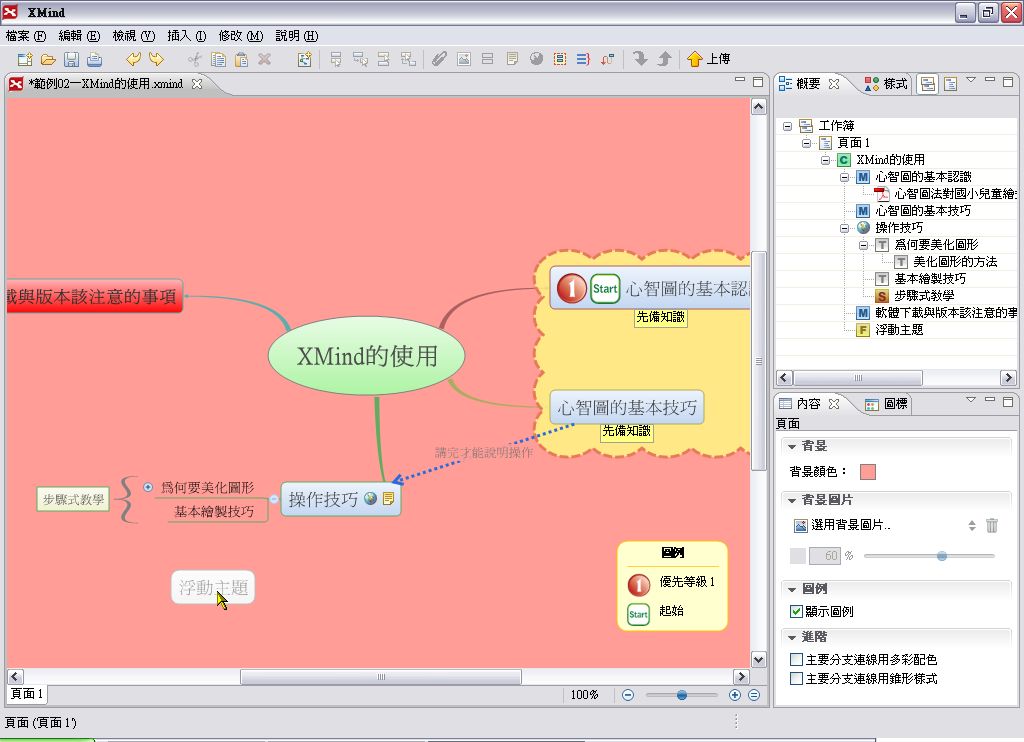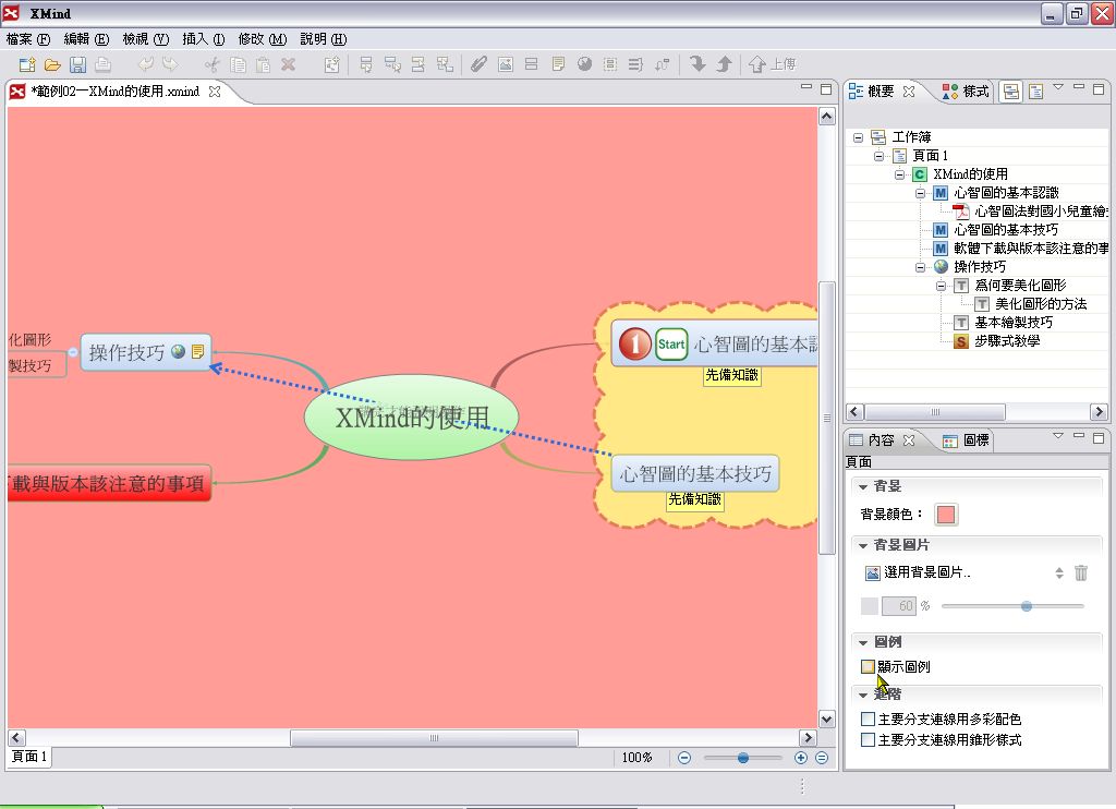 我們在部份主題內加入了圖標,為了日後方便閱讀起見,可以加入圖例。圖例的意思是告訴人家某個圖標代表什麼意思,顯示出來,有助於他人解讀心智圖的內容。所以這裡我們就在內容面板上勾選「顯示圖例」。