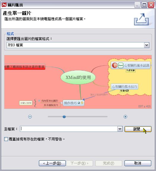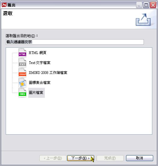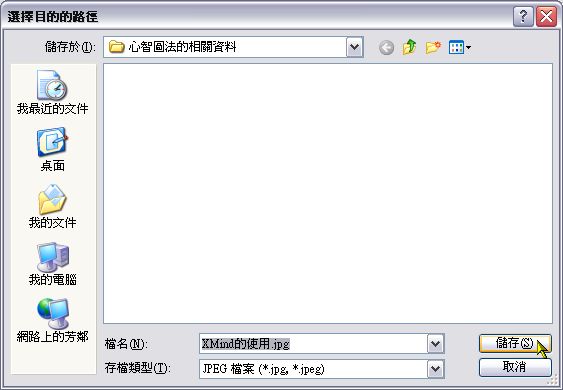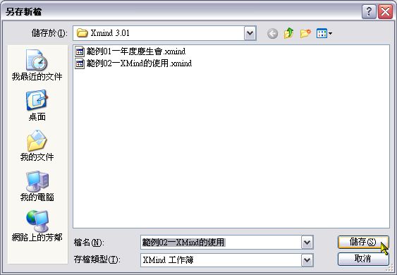 檔案編輯後,是一定要儲存的啦!(好像在講廢話),只是儲存格式的選擇,在 XMind 內只有一種(當然,只有這一種日後能加以編輯),無法直接存成其他的格式。若想要存成不同的格式好做其他應用,只能透過匯出一法了。