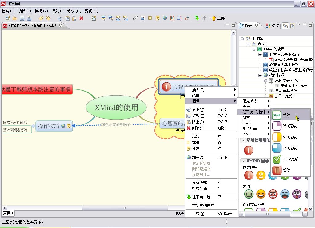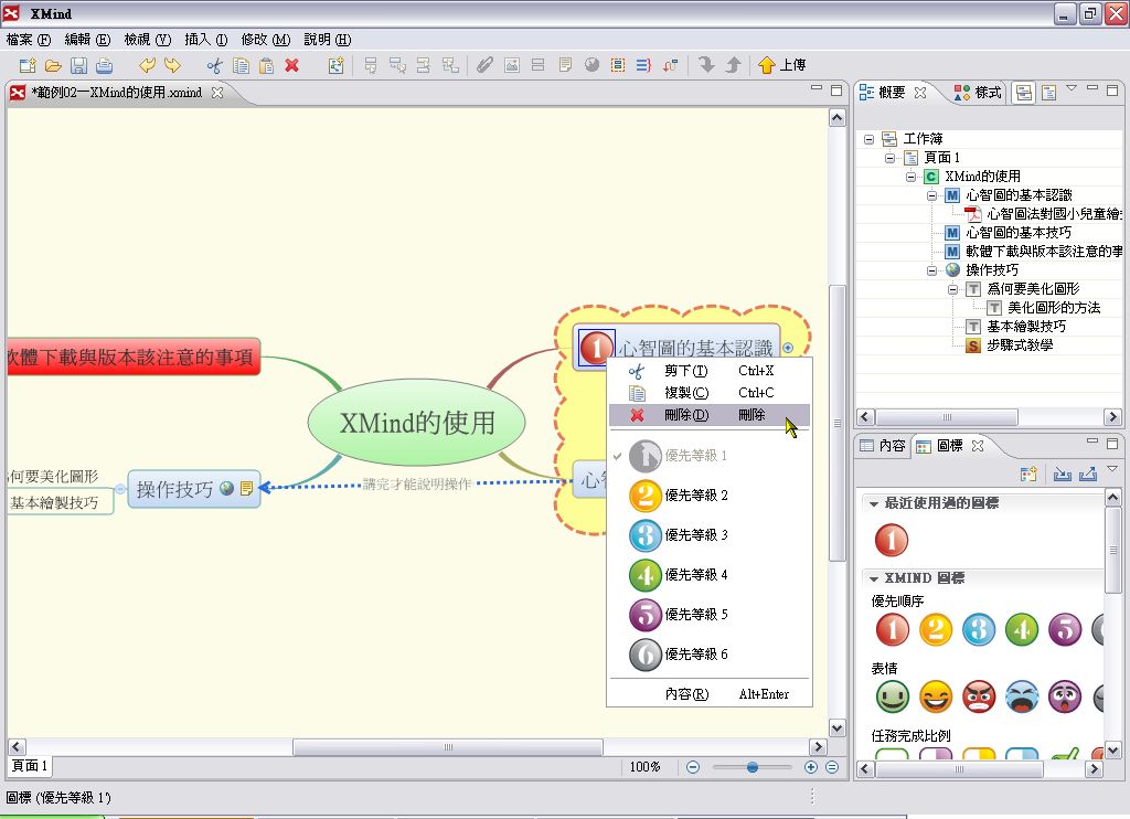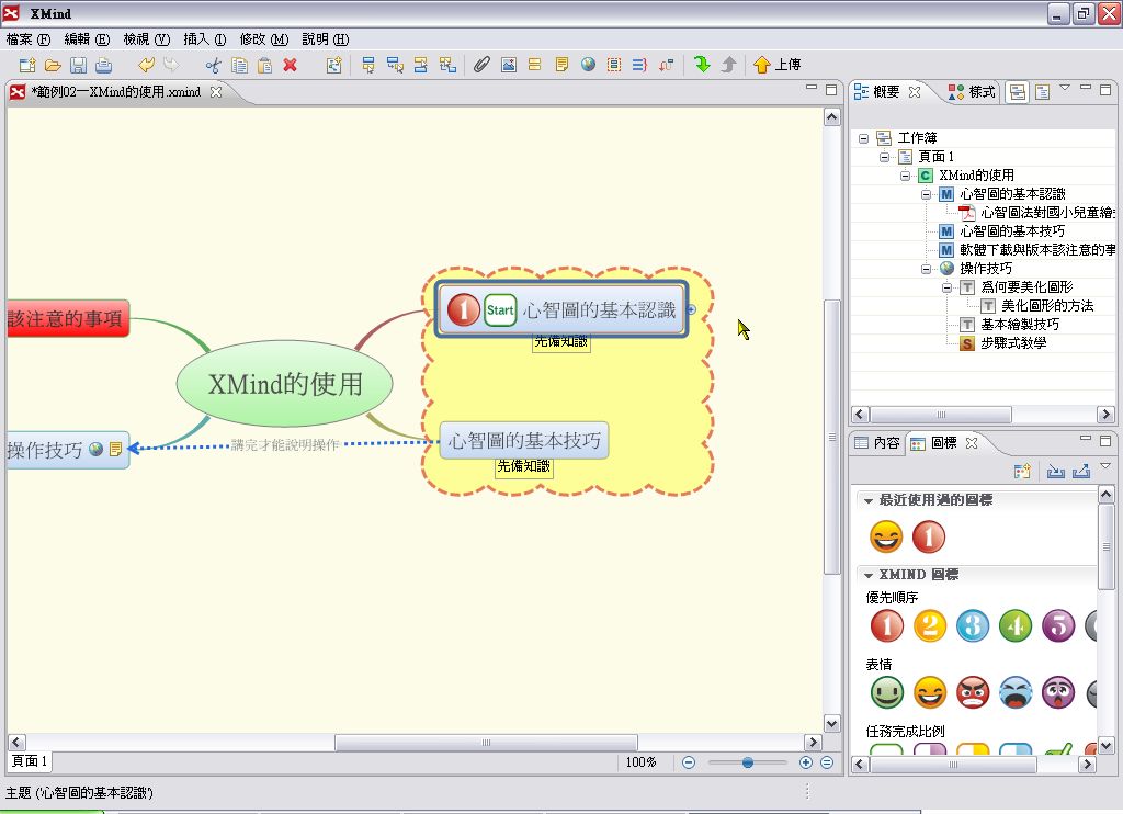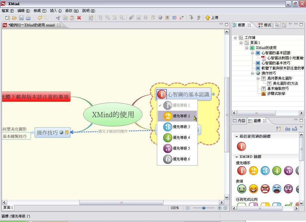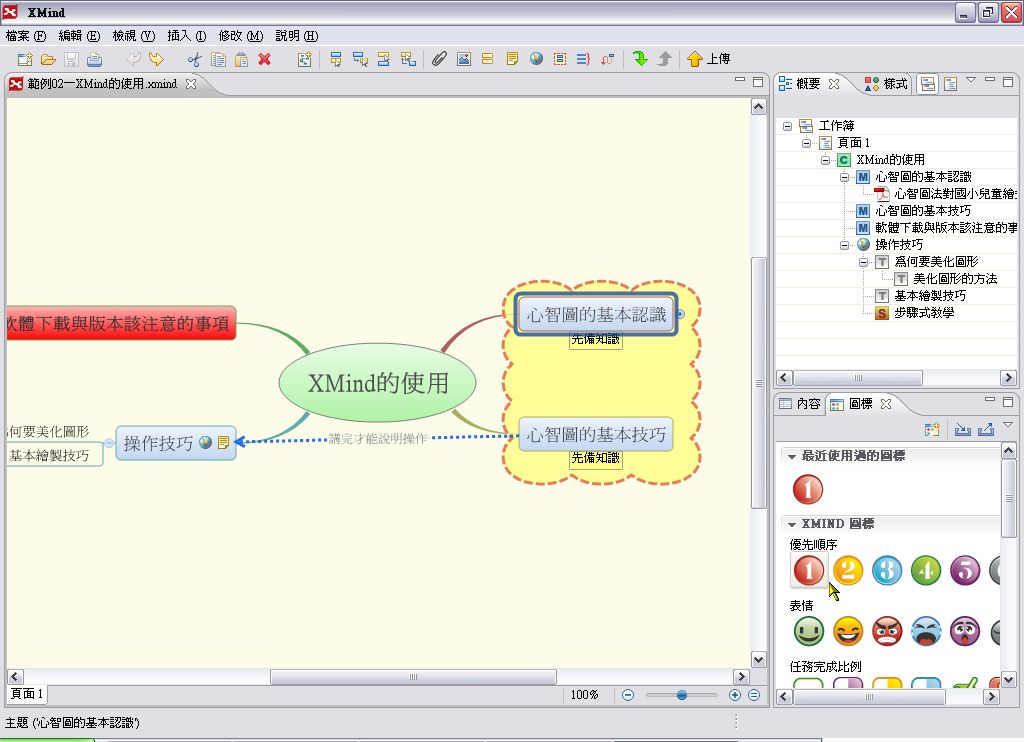 圖標是一些構圖簡易的表意小圖,適當地運用有助於瞭解內容,並且能讓畫面顯得更加活潑。只是 XMind 的圖標,其運用的範圍只限於主題內,也就是說,它是用來協助瞭解主題內容,或者標示重點、歷程、順序等。