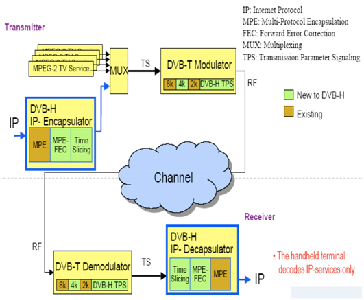 有鑑於此,國立台北科技大學電子工程系李仁貴教授,於 2007 年帶領研發團隊組成相關的研究計畫,目標是建立一個符合標準的手持式數位電視 (Digital Video Broadcasting-Handheld, DVB-H) 廣播頭端之 IP 封裝器 (IP Encapsulator, IPE) 以及行動終端之 IP 解封裝器 (IP Decapsulator, IPD) 技術的實作,並以軟體的方式實現在 Linux-Based 平台,系統架構請參考圖1。