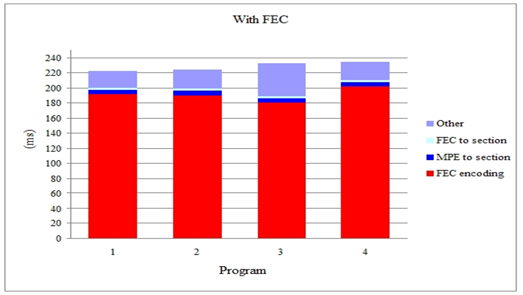 VLC server 產生的 IP 串流經由 DVB-H 頭端平台的 IPE 與 MPEG-2 傳輸串流多工器轉換成 Transport Stream (TS) 封包再由 RF 調變器發射。圖 2 為頭端 IPE 進行資料封裝時所花費的計算時間。接收端則是利用 DVB-T 的接收器將 TS 串流接收下來後進行解碼的工作。圖 3 為 IPD 在接收不同的 FEC-Frame 大小時,對於資料接收解碼的影響。