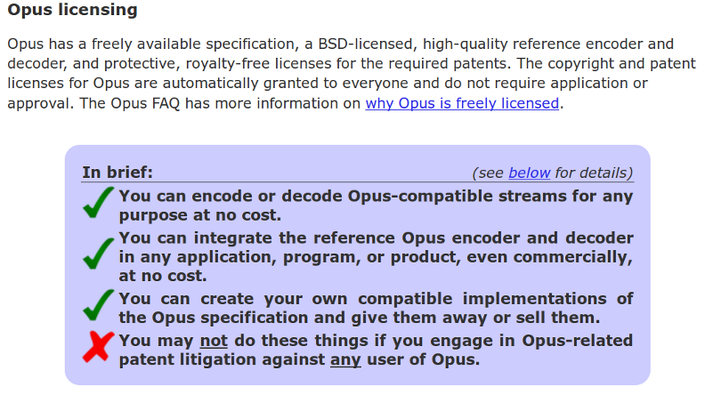 ▲ 圖1:Opus 的授權說明專頁清楚地說明了使用者可以如何利用 Opus 的程式碼與其中的專利技術