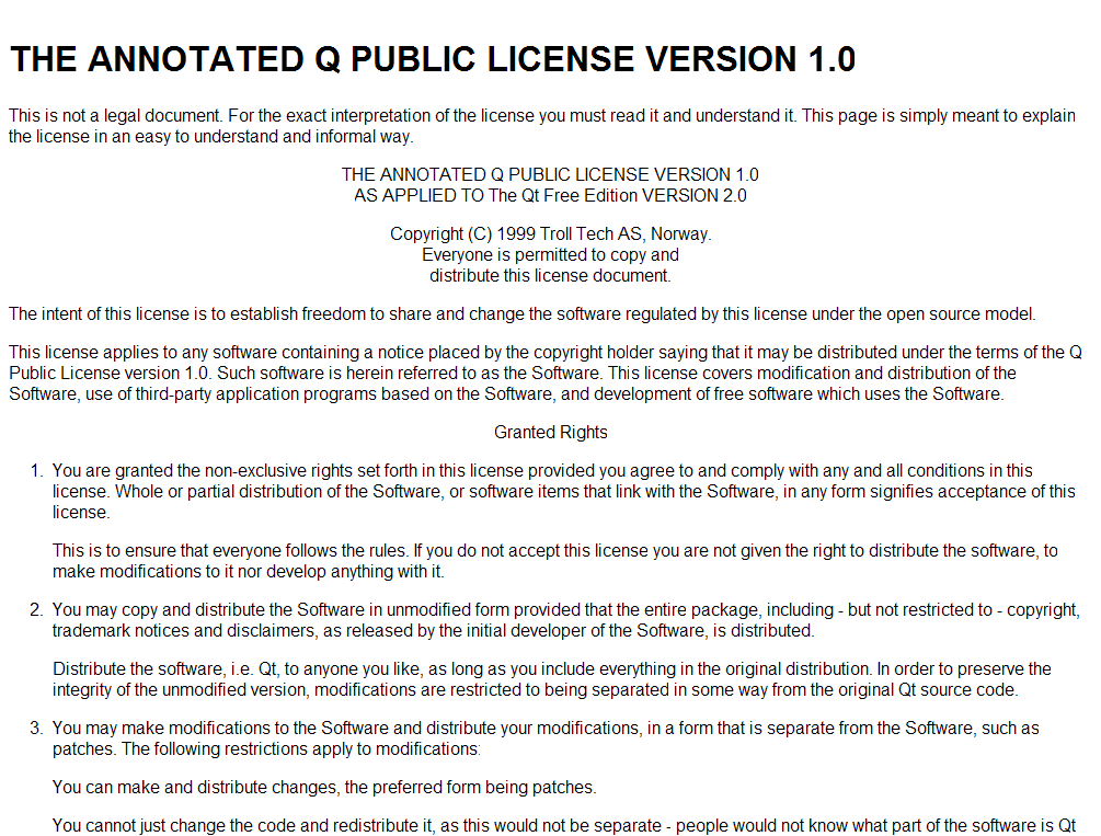 ▲ 圖1 THE ANNOTATED Q PUBLIC LICENSE VERSION 1.0,2012 年 3 月 16 日截圖於右列網址之庫頁存檔:https://www.trolltech.com/licenses/qpl-annotated.html