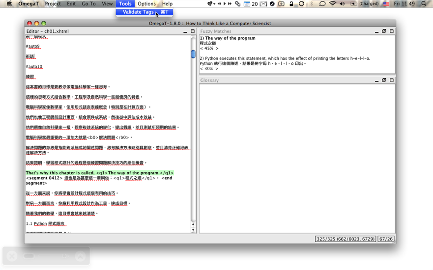 如此一句句地翻譯下去,將整份文件就翻譯完成後,譯者必須先檢查文件所有的特殊格式標籤是否全數保留,這當然不是叫譯者一句句校對,我們可以使用【Tools】中的【Validate Tags】功能讓 CAT Tools 自行檢查。