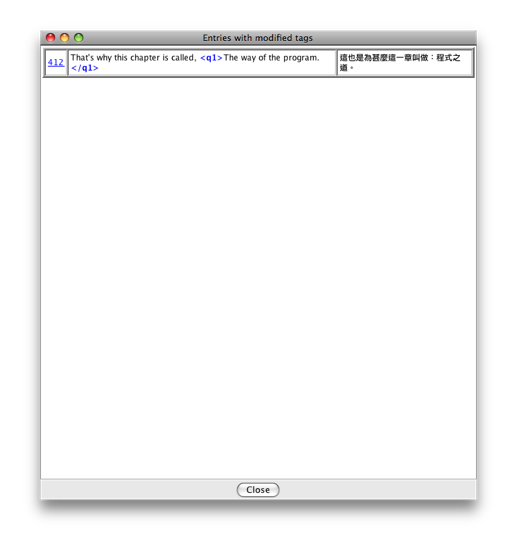 如果 CAT Tools 找到了格式不符合或是遺漏的標籤,則 CAT Tools 會顯示提示,提示中第一部分為 Segment 的編號,第二部分為原文標籤的形式,第三部分為譯文標籤形式。