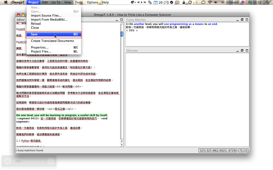 接下來可別忘了儲存你的工作成果,因為 OmegaT 只是將你的翻譯儲存到 TM 檔中,並不會幫你自動儲存文件。