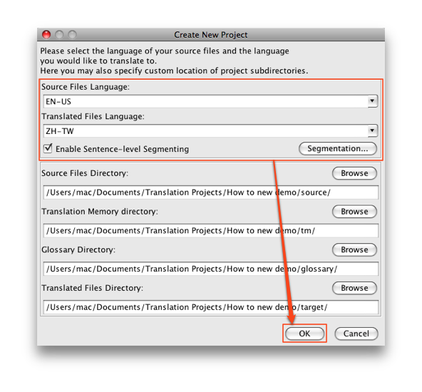 接著必須選擇原文和譯文所使用的語言,請在「Source Files Language」指定原文語言,而在「Translated Files Language」選擇翻譯語言。而底部的四個欄位則可以指定原文、譯文、TM 檔和詞彙表的存放目錄。