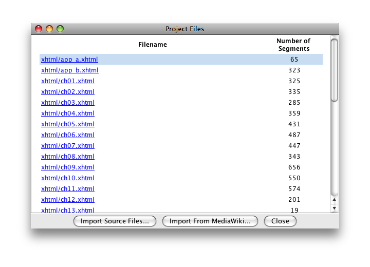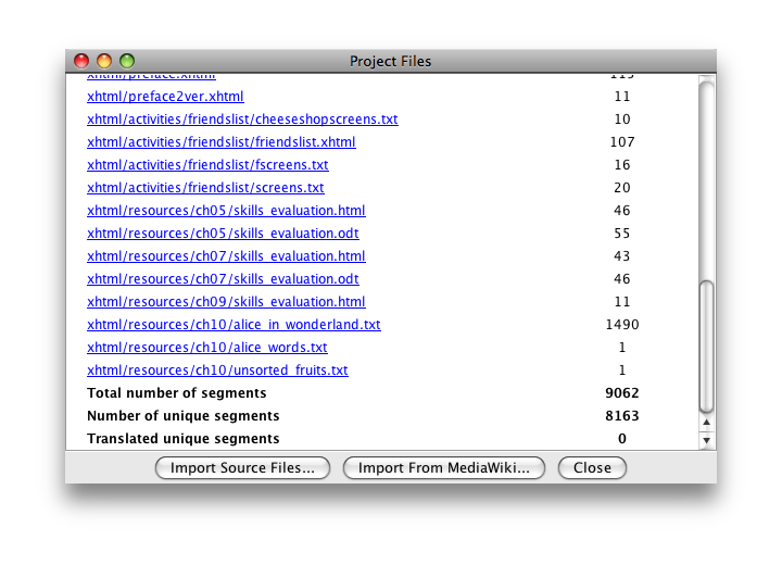 然後你就可以在「Project Files」視窗中看到這個計畫中的所有文件,並可以看到整個計畫中分成幾個段落(segments),和已譯與未譯的段落。