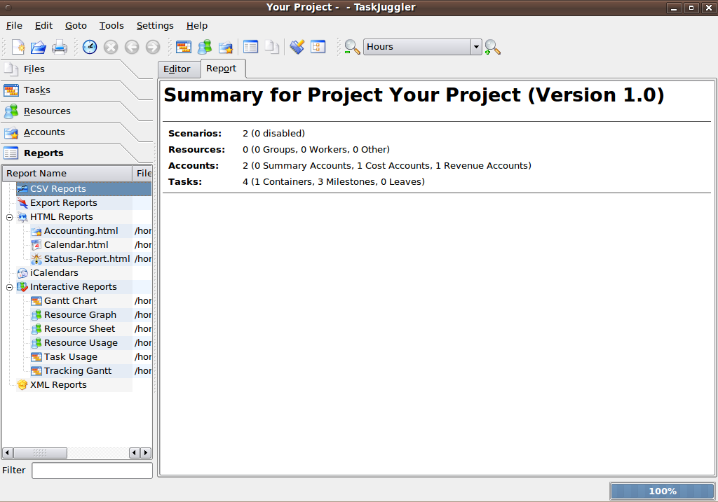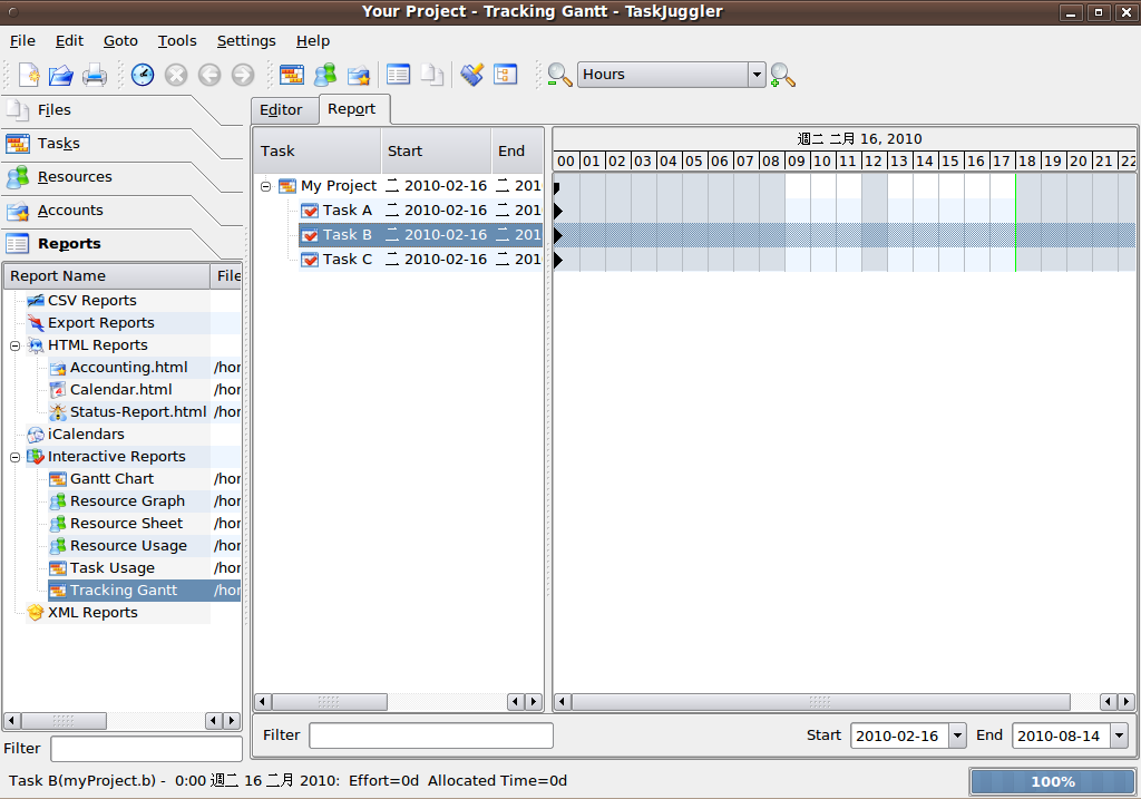 至於輸出報表方面,TaskJuggler 也提供了多元化的輸出格式,例如 HTML 或是 XML 的報表輸出格式即為一例。這些採用標準格式的輸出報表,也能讓使用者在有需求時,可以進行進一步的後續處理。由於檔案格式本身已經是標準格式,因此在有必要時也能直接以其他應用軟體進行分析處理。如果輸出報表希望以網頁的方式呈現給其他人查詢,這樣的輸出格式也相當適合整合至網站之中。使用者需要做的,只是在原有的網站架構中加入新的程式碼,以便將這些輸出報表整合至現在的網頁原始檔中。