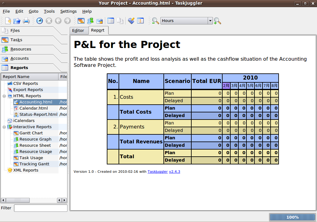 TaskJuggler 提供多元化的標準輸出格式,包括 HTML 與 XML 等等